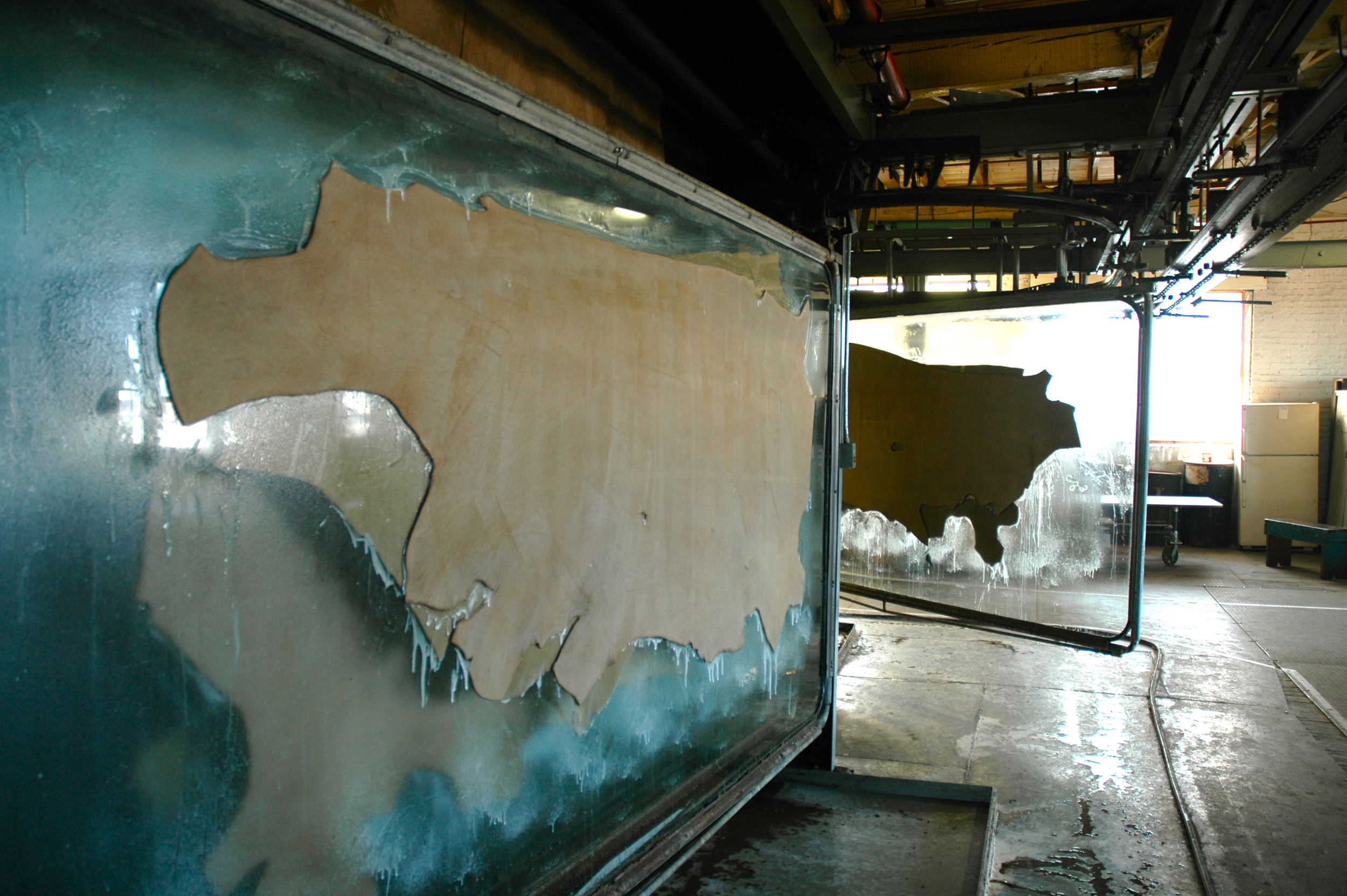 Pasting is the application of leather to large glass, steel, or ceramic "plates." A plant based starch is mixed into a paste, which is used to adhere the hide to the plate. The drying process takes about 5 hours and utilizes steam, heat, and moving air. Think of a pasting unit as a big combination oven with different zones. This yields a leather with "flat," uniform grain. By sticking the leather against a medium that is static, it keeps the leather from shrinking. Good for yields, and good for products that need to not stretch - like load bearing straps.