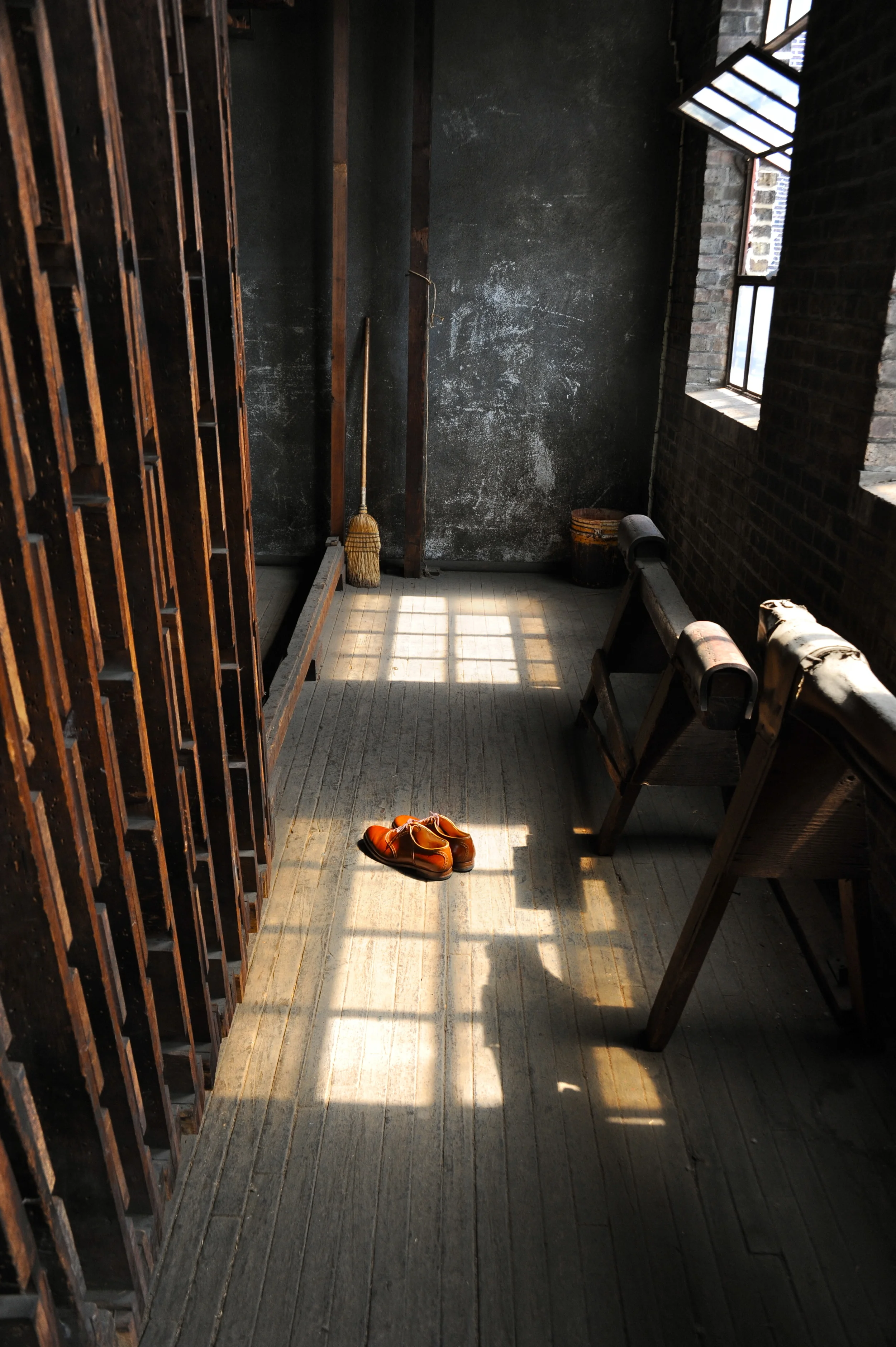 That brings us to toggling. Toggled hides are allowed to air dry, but they a stretched gently through the use of small clamps called toggles. It allows the leather to shrink and plump some, but holds it firm to reduce stretchability. I have to admit, my motivation for this post was the fact that the toggling room is my favorite room in the building. It's unnaturally quiet and well lit by natural light - and it's clean as far as rooms in a tannery go. Toggling is the most time consuming in terms of labor, but it's not as time consuming as "tacking," the predecessor to toggling. Tacking is the same as toggling, except instead of reusable clamps, we used hammers, nails, and wood frames.